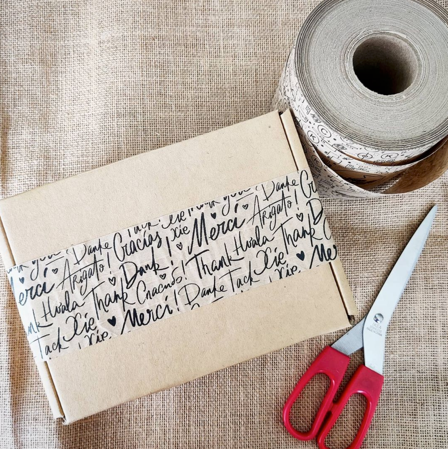 Our water-activated custom printed tape is reinforced to create a strong bond in just one pass. Each roll is 70mm (approx. 2.75") wide and every 25 meters is enough to seal over 50 packages.